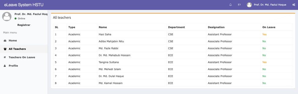 There is reporting system in our system which shows that which teachers are on leave, from when the teacher’s leave have started and on which date the leaves will expire. The registrar and the VC will be able to see the report for all the teachers. The dean will be able to see the report for all the teachers of his faculty and the chairman will be able to see the report for all the teachers of his department.