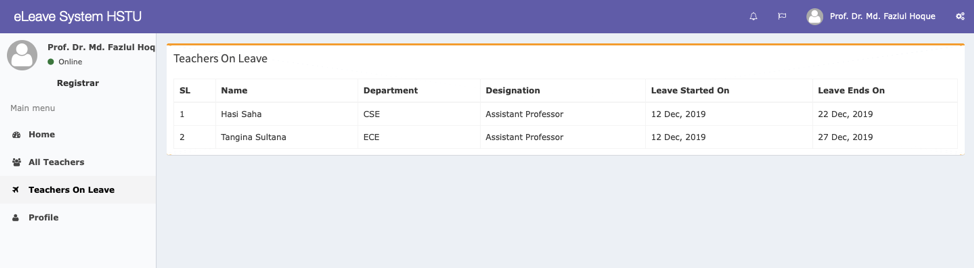 In every university teachers take short or long leave for higher education or other purposes. In HSTU university the leave management system is manual. From application submission to approval, all the tasks are handled manually in this manual system. In this system all persons involving the system have to suffer a lot to complete the whole process. It is also very time consuming. There is no proper tracking in this manual system. If the system becomes digital then a huge amount of sufferings can be reduced and both the teachers and the administrative bodies can easily complete the processes. Considering the problems and complexity of this manual system I have proposed a digital solution by developing a software called “HSTU eLeave”.