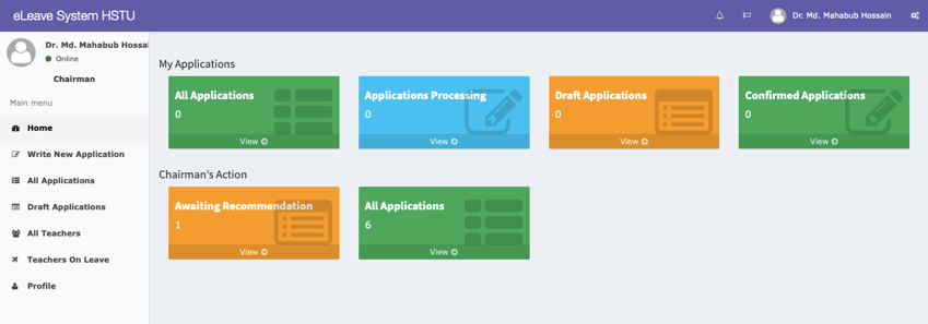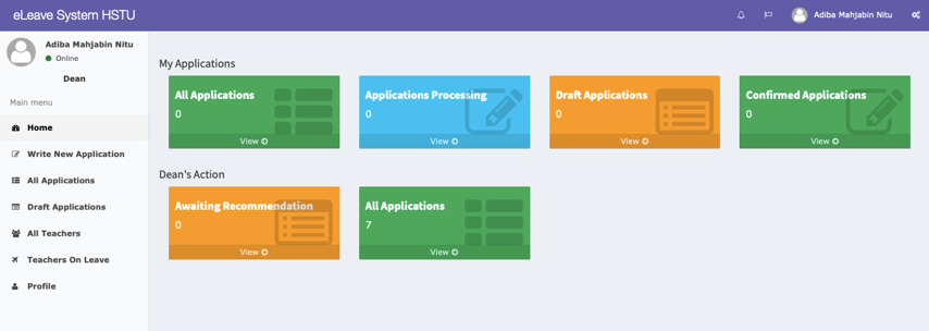 The software is an online leave management software specially designed for the leave management of HSTU. This software is very different from typical leave management software. There are various types of users with various types of activities and roles who will use the software. The software consist of several modules and different modules are for different type of works and functionalities. The software completely follows the processing strategy of leave applications HSTU and so the users of the software should follow the operating procedures as instructed.