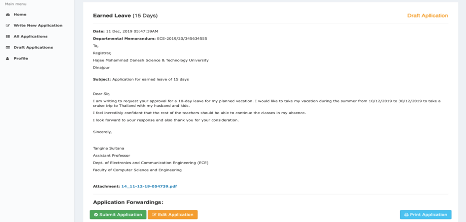At first, a teacher who need a leave will write an application. The application may contain necessary attachment and a departmental memorandum which is provided from departmental office. All applications are stored as draft application until they are submitted to the chairman. Any draft application can be edited as many times as the teacher wants.