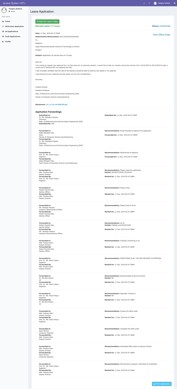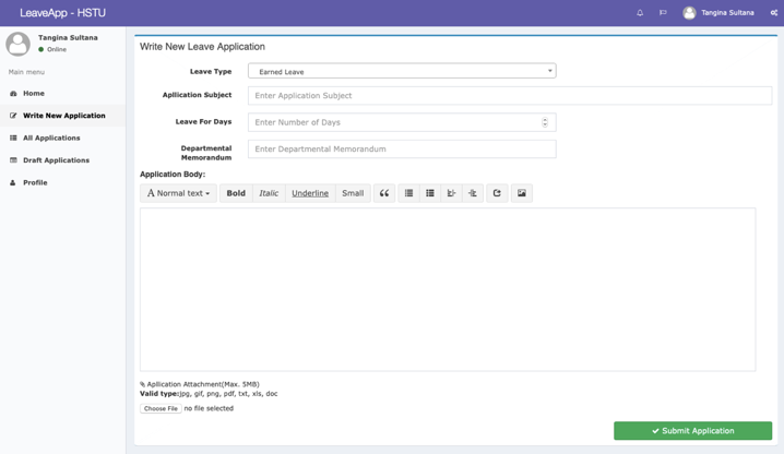 At first, a teacher who need a leave will write an application. The application may contain necessary attachment and a departmental memorandum which is provided from departmental office. All applications are stored as draft application until they are submitted to the chairman. Any draft application can be edited as many times as the teacher wants.