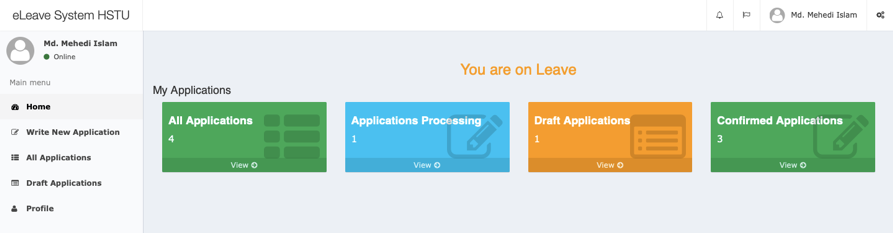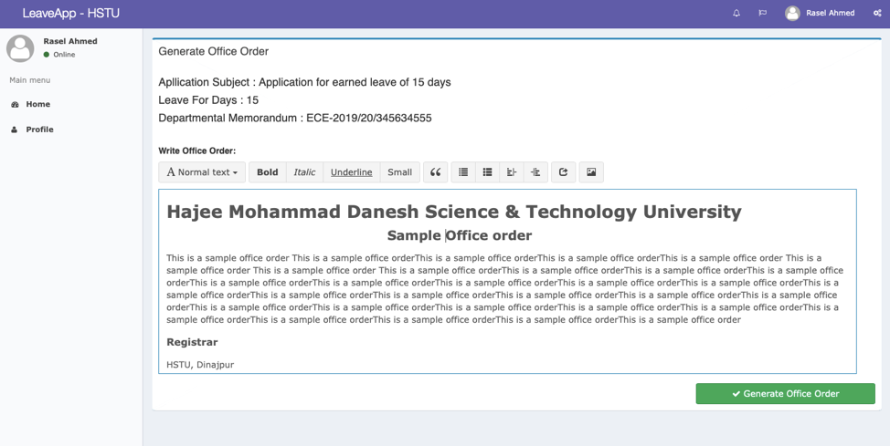 The software is an online leave management software specially designed for the leave management of HSTU. This software is very different from typical leave management software. There are various types of users with various types of activities and roles who will use the software. The software consist of several modules and different modules are for different type of works and functionalities. The software completely follows the processing strategy of leave applications HSTU and so the users of the software should follow the operating procedures as instructed.